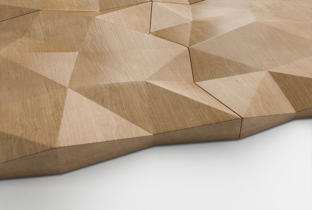 "Polee" is a polygonal shaped design for interior wall tiling. Different from standard tiling shapes it has triangular endings which fit with its polygonal design and hide/minimize the tiling lines/borders. The shape can be used with any material in accordance with any interior elements/designs.